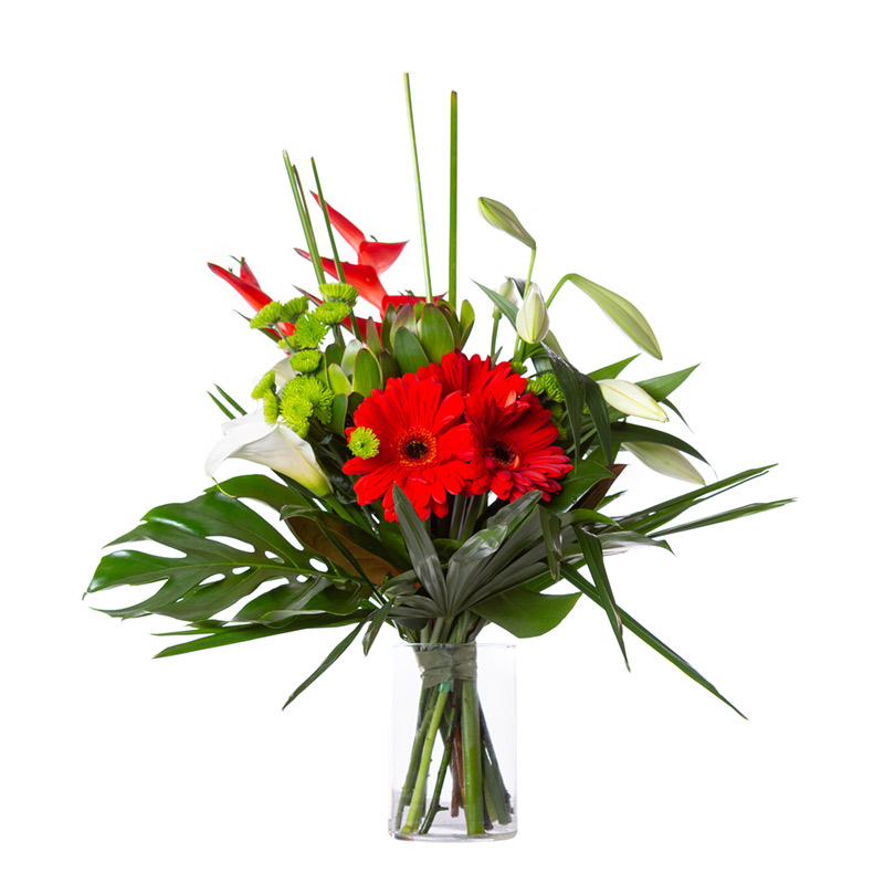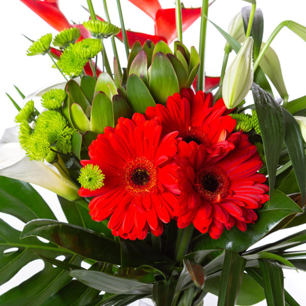 Love red!? We do. This bouquet features our own bright red gerberas and a selection of leucadendron, heliconia, chrysanthemums, and arum lillies.
