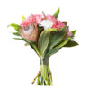 A modern twist on the classic bouquet, featuring proteas, gerberas, roses and carnations amongst tropical foliage. Hand tied and gift wrapped.